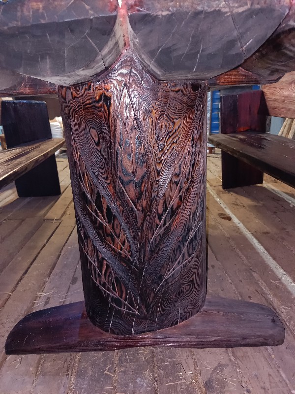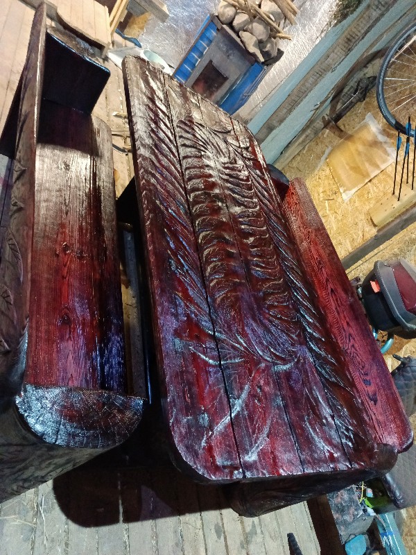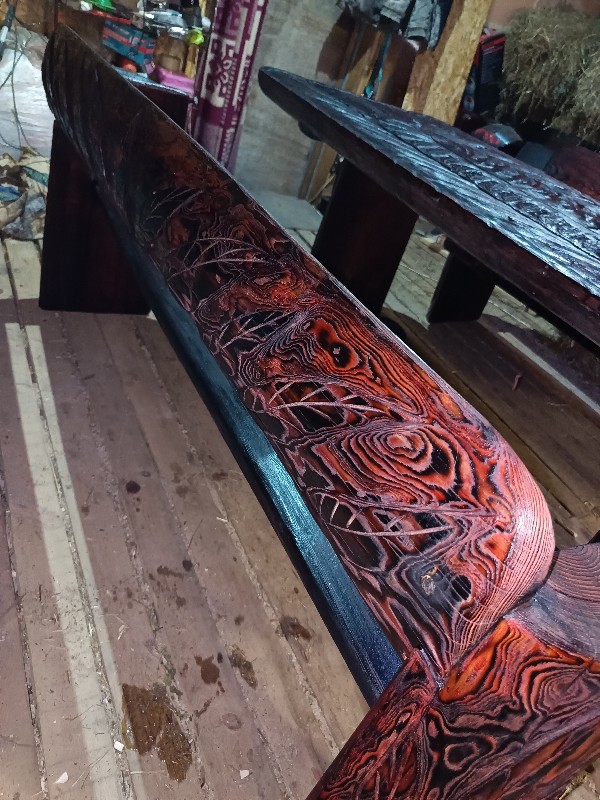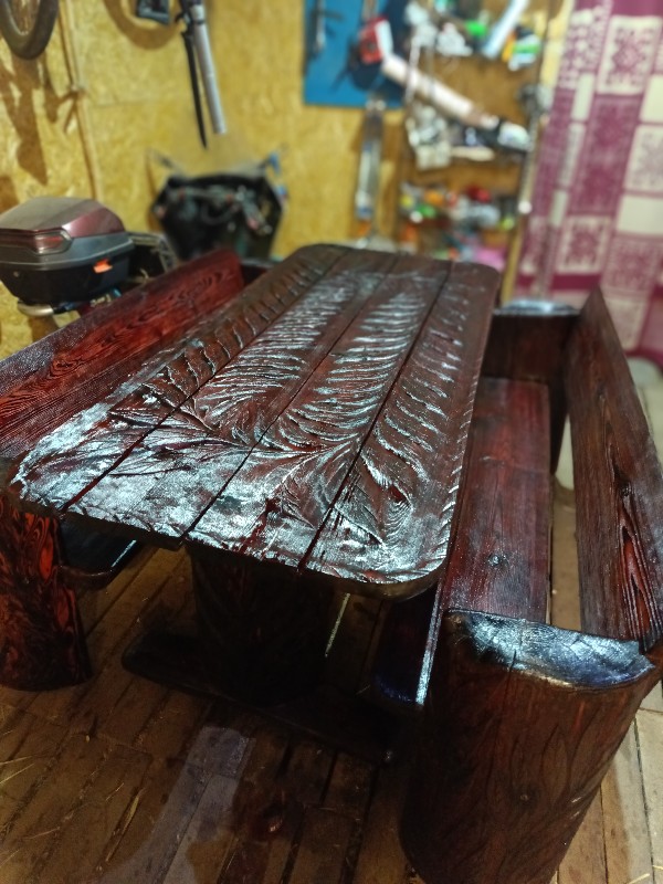 Продам комплект садовой мебели из массива дерева, ручной работы. Материал Магаданская мачтовая Лиственница. Весь комплект склеен и пропитан эпоксидной смолой. Лак сделан по дедевскому рецепту на основе янтаря. Делал не на продажу, для себя.По всему комплекту идëт резной рисунок 3D с выделением структуры древесины. Очень красивый комплект. Размер стола 180/80.Скамейки 180 две штуки.